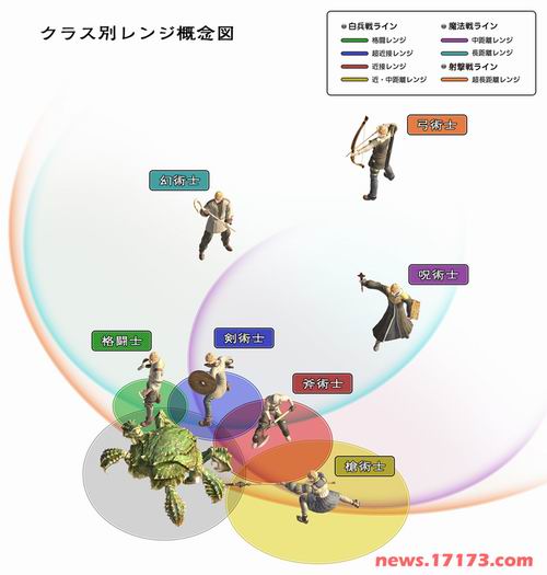 各职业的战斗位置图解,同是近战职业攻击范围也有不同,远程则是两个法系和射程最远的弓术士。