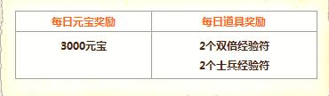 每个封测账号,第一次登陆后的第二天即可获得3000元宝、2个武将经验符和2个士兵经验符: