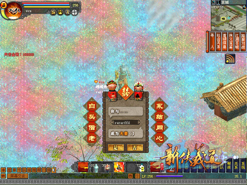 “前生万次的回眸,今生永恒的爱恋” 公子佳人,本是良配,不应使千山的阻隔造就万世的遗憾.江湖,这个爱恨情仇交织的地方,新侠义道为您牵引传世的情缘。当每位玩家30级时,可以到红娘处,输入您的年龄,QQ号,所在地区,爱好,四个信息。在数据库内寻找一个与玩家年龄差距在2岁以内的异性玩家(男性比女性大2岁范围),当搜索到合适配对人选之后(必须在线),系统将发送消息给二人。将配对玩家的性别、年龄、QQ号、玩家游戏名告知对方。(每位玩家只能配对1人)由系统配对成功,并且结婚的玩家可以获得限量版“同心配”(移动速度+20%,传送功能)。