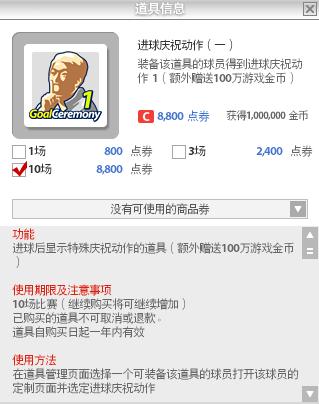 《FIFA online 2》为了能让游戏里的虚拟球员做出更多的个性化进球庆祝动作,特地在游戏里设置了进球庆祝动作道具,该道具的功能非常强大,8800点券的花费可以得到该道具10场的使用,不但可以让玩家的手下的球员在比赛中进球后,做出特殊的进球庆祝动作,加强比赛的真实感,在购买道具后球员进球后的个性化庆祝动作会持续10场,当然不止这些,更重要的是,在玩家购买进球动作道具后,会得到额外的100万游戏金币赠送!