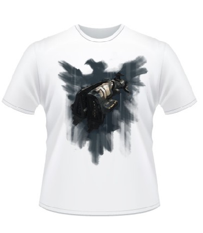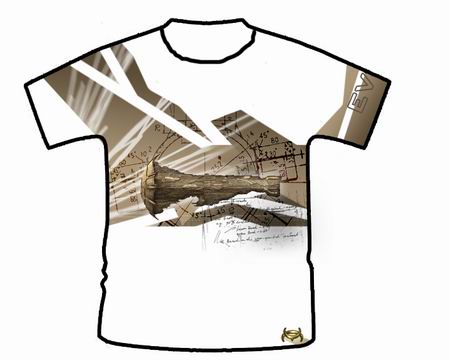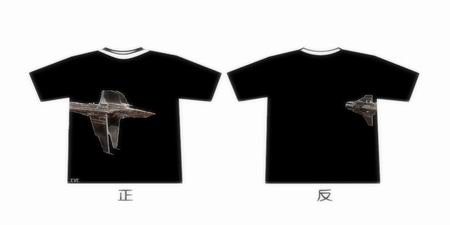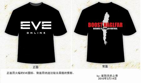 第二幅作品来自玩家“星期天的上帝”。T恤衫正面采用EVE LOGO,背面则为纳迦法级无畏舰的剪影,虽然看不清战舰的形状,但剪影的效果让人充满想象。我想,任何一位EVE玩家都能认出这艘太空巨舰那庞大的身躯。