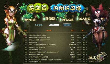 许愿墙上的心愿风格迥异,幽默有如“上帝说满足我一个愿望,我说要世界和平,他说太难了换一个吧,我说要一个龙之谷激活码,他沉思了一下说道‘拿地球仪我再看看’!”;时尚风格“哥许的不是愿,也不是寂寞,而是激活码!”;悲情路线“冰天雪地跪求激活码一个”;朴实无华之“激活码啊激活码~~~~~~~”;大爱无疆的“预祝龙之谷内测圆满成功~~~!希望所有喜欢龙之谷的朋友都拿到激活码”。