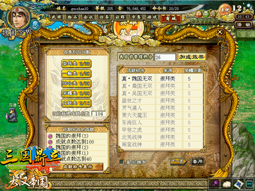 在新版“大汉帝国”中,玩家所能完成的成就也可分为几大项,分别是崇拜类、一般类、综合类、荣耀类和成就类。崇拜类主要就是需要玩家去积累各大势力的声望,比如说当玩家在魏国的声望积累到了一定数量,就能够获得超炫称号“真.魏国无双”!而一般类中,当玩家在军团中作出良好贡献的时候,就能够获得诸如“名声远播”之类的称号!综合类所包含的内容比较多,玩家在日常中完成的很多操作,都可能获得到成就称号。而荣耀类,则是需要玩家重视起每日的活动来,比如活动“井底之熊”,就能够送给玩家称号“熊霸天下”!最后的成就类,则会综合玩家的成就积分,为大家送出终极称号!