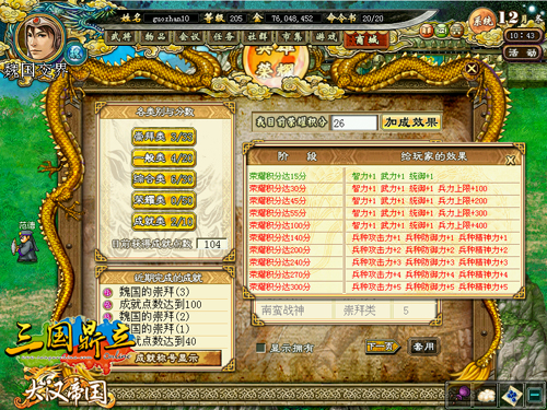 《三国鼎立》一直都是一个趣味十足的游戏世界,在这里,您不仅能够体会到SLG战棋模式的经典再现,更能体会到最轻松最好玩的游戏!随着“大汉帝国”一起推出的“成就系统”,就将游戏内的新旧系统都网罗在一起,为各种活动的赢家安排了各种搞笑好玩的成就名字!