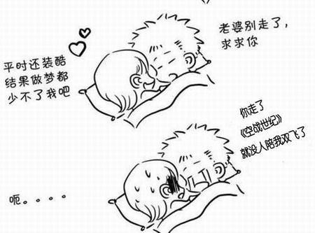 由《空战世纪》某玩家自己改编的4格漫画阐述了一个简单又有趣的游戏故事,小夫妻俩晚上同卧一榻,漫画男猪梦话连篇呼唤娇妻名字,女猪心中暗自窃喜,不曾想其实男猪的想法是这样的......