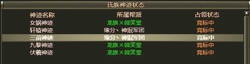 在《龙》各大场景中,都出现神迹,传闻神迹拥有着无穷的力量,拥有神迹者,便可获得修道成仙的门道。同时,拥有神迹的帮会,便可时刻都有着神佑状态呢!但是神迹极其有限,目前在《龙》中,只有凤翔、逐鹿、巫水、武夷以及昆仑拥有神迹,分别代表着女娲神迹、轩辕神迹、三苗神迹、九黎神迹以及伏羲神迹。