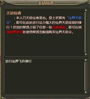 除了能够购买到迅速升级的树种以及打造装备所需的珍稀材料外,拥有神迹的帮会还能购买仙界天劫令。《龙》推出神迹争夺战的同时,也更新的仙界修行体系,飞升仙者、渡劫仙者以及天劫仙者出现在主城中,使用仙界天劫令,便可习得相关的技能,为你今后的飞升成仙以及成仙渡劫做好准备。