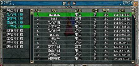 本游戏的排名主要有:等级排名,财富排名,声望排名,荣誉排名,元神排名,家族排名,通常只显示排名前100名的玩家的各种情况。其中每项排名又分为世界和各门派四种。