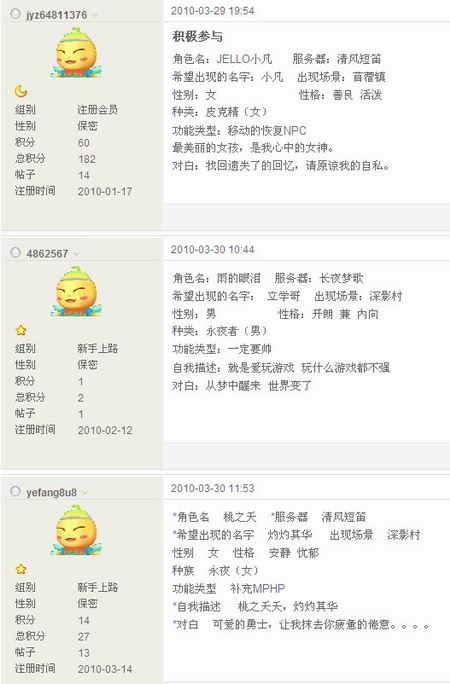 在这火爆热闹的时刻,“做纳雅世界的‘阿凡达’”活动全面上线。已经有很多玩家报名申请自己的形象化身贝隆托姆大陆。在论坛的申请贴上,我们能看到各种风格的化身,有浪漫的玩家想化身星纹岗哨下孤独的赏月者;有活泼开朗的玩家想化身于苜蓿镇,只是为了傻傻的发笑;有美丽勇敢的玩家想化身最为坚强的公主;有痴情的玩家想化身在公主旁边,一辈子守候着她!更有高傲的玩家想化身高贵永夜永远矗立勇士大陆。
