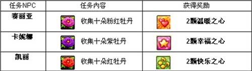 为喜迎世博,DNF在4月20号-5月4号期间举行“与世博同行,鲜花美化地下城”活动,活动期间,每一位DNF勇士都可以在赛丽亚、卡妮娜和凯丽处接活动任务,按照任务流程完成就可以获得精美奖品哦!只要你收集十朵粉红牡丹交给赛丽亚就可以获得两颗“温暖之心”;只要你收集十朵紫牡丹交给卡妮娜就可以获得两颗“幸福之心”,而你只要收集十朵红牡丹交给凯丽就可以获得2颗“快乐之心”,简单吧,而且这些“温暖之心”、“幸福之心”和“快乐之心”还可以为勇士们的战斗提供巨大功效,让你的格斗更加劲爽!