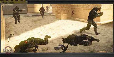 沙砾、灰尘、残垣断壁,这是这组截图第一印象,而背景中依稀可见的古老金字塔令我们不禁想到了新版本中即将推出的竞技地图——金字塔。是的,这就是新资料片中推出的新竞技地图“金字塔”,地图中沙尘的金黄与战士们黄色的军服融为一体,而那些漫漫黄沙中倒下的身影更显几分悲壮和沧桑。相信在金字塔的环境中战斗能给大家带来更加震撼的战场体验,而这样的激烈战斗也最适合你死我活的竞技模式。