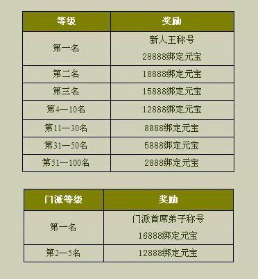 4月30日14:00,《西游记》开放万人双线新区域“黄金阁”。同时,官方将拿出28888元宝重金悬赏“新人冲级王”,并为在“新人冲级赛”中排名前100名的玩家准备了大量商城元宝奖励。此外,在“门派冲级赛”中排名第一的玩家还将获得“门派首席弟子”的特殊称号以及16888元宝。