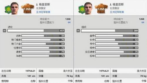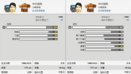 相比国安队球员游戏里数值的寒酸,日本川崎队的中场核心中村宪刚从数值上看,明显要比国安球员高出一截,身体255的数值里包含了87的体能、84的力量和84的稳定性,这样的数值在欧洲球员中也算的上出色了,而且这名中前卫还有87的速度,经常能出人意料的靠个人能力帮助球队,但是无奈国安这场比赛准备充分,队长徐云龙带领的御林军防线彻底遏制了中村的发挥。