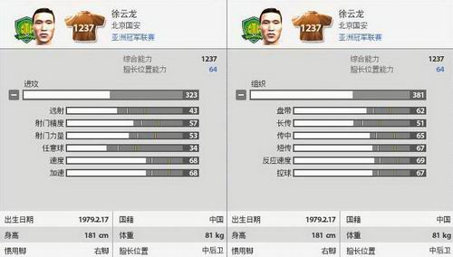 国安的队长徐云龙被京城球迷亲切的称为“中国普约尔”,铁血男人的风范一直受到很多北京球迷的喜爱,在游戏里他的数值不高,但速度和加速都达到68也总算及格,盘带、短传、控球也都在接近70,虽然在场上的表现看起来总是有些莽撞,但是良好的身体素质和勇猛顽强的比赛作风还是对球队帮助很大。
