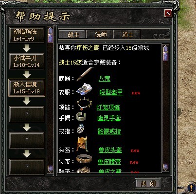 “新”传奇外传中新增内置帮助,指导玩家从1级-100级如何换装备、去哪升级打怪、可以学习哪些技能等等。全面贴心的细致服务帮助玩家一路顺利成长,不走弯路。你将达到哪个阶段呢?初临玛法、小试牛刀、渐入佳境、扶危济困、勇猛无匹、冲锋陷阵,后面还有很多犀利阶段等你去闯荡。想知道你能达到哪个成就吗?来“新”传奇外传中一展风采吧。