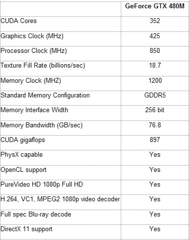 GeForce GTX 480M在高清视频解码性能上大幅提升,同时提供3D Vision and PhysX技术。GeForce GTX 480M显卡的GPU频率为425MHz,核心频率850MHz,显存频率1200MHz。具备352个CUDA核心,256bit位宽显存接口,最高支持2GB GDDR5显存。