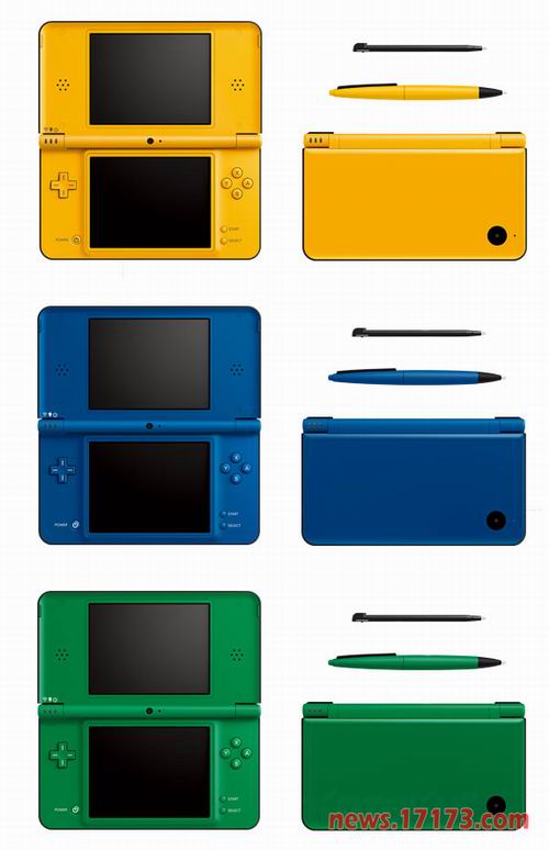 任天堂公司近日公布了三款新配色的NDS,外表分别为蓝、绿、黄。其同时宣布将在E3结束后的第一个周末下调日本地区NDSi和NDSi XL的售价,业内人士分析此举是为了将在今年E3上公布的拥有裸眼3D技术的新款掌机Nintendo 3DS做准备。(文:17173 晨星)