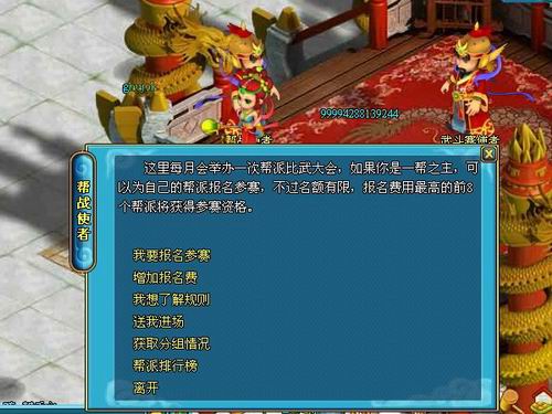 新服帮派争霸赛将在新服开启后不久火爆出场,帮派争霸活动结束后系统将自行统计各帮派积分,积分前三名的帮派所获得的大礼是无法形容的。帮主将获得价值188RMB的水之精灵神宠,15000礼金各等级秘银5颗,帮派成员每人都将获得各种自动补给药水一瓶,双倍经验符等等奖励。