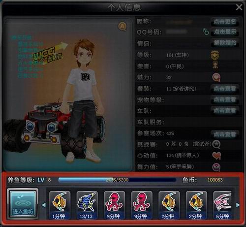 登入《QQ飞车》游戏大厅后,可以点击“飞车鱼坊”按钮即可进入鱼坊开始养鱼;当然您也可以通过点击右侧的“个人信息”按钮,查看养鱼缩略面板,再进入您的专属空间个人鱼坊中。