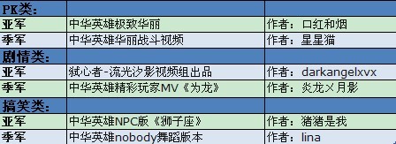 二、《中华英雄》原创视频大赛——17173编辑&玩家评选获奖作品前10名获奖名单: