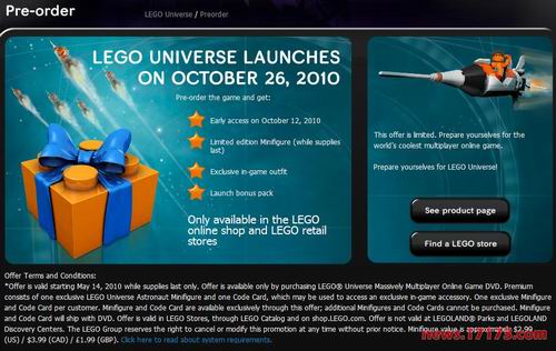 在今年的E3展会上,由著名玩具公司乐高集团与游戏开发公司NetDevil携手开发的大型多人在线游戏《乐高宇宙》(LEGO Universe)正式宣布其将在今年10月26日开始正式运营。而《乐高宇宙》的官方网站近日也随即开通了预定频道,玩家可以通过乐高商城预定这款游戏,售价39.99美元(折合204人民币),购买者除了能够提前在10月12日就进入游戏外,预定的玩家还能获得一个限量版的游戏模型、一件特殊的游戏人物服装和额外的一些奖励。(文:17173 晨星)