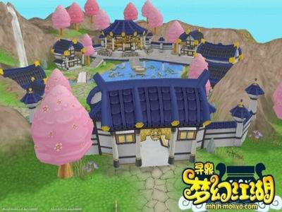 天门,《梦幻江湖》三大门派之一。在一个桃花盛开的季节前去,四处袅绕着鸟语和花香,庄外的一条瀑布由西而北直流而下汇聚在天门中央的掬水潭,好一个秀丽的江南美景。