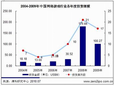 2009年,中国网络游戏行业共发生17笔投资,其中已经披露金额的投资案例为15起,披露投资金额总额为10027万美元,平均单笔投资金额为668万美元。总投资案例数量同比下降19.05%,披露的投资金额总数同比下降44.12%。这是2005年以来,中国网络游戏市场投资案例及投资金额首次出现下滑局面,在一定程度上说明中国网络游戏市场已经进入了缓慢增长期,资本市场对网络游戏的态度更加冷静和客观。