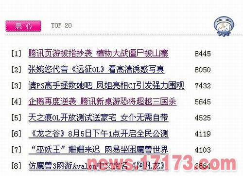 在本月17173“恶心”感觉前20名排行榜中,前2条新闻以均已高票数入驻头筹,第三条作为最新新闻也紧追而上,记者发稿前,查询腾讯官网,发现一款名为《超级明星》的游戏业有明显山寨经典单机游戏《明显志愿》之嫌。腾讯此串高频率山寨批发事件并引发玩家热议。