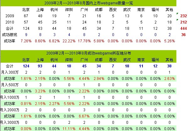 和IT行业分布相同,网页游戏企业多分布在北京、上海、广州、深圳、杭州等中心城市,其中北京市仅去年一年就新增网页游戏产品124款。在网页游戏产品开发方面,成功率过低仍然对网页游戏市场扩张造成严重影响,深圳地区45款产品仅有30%能够盈利,而这个数据在其他地方更少。一位不愿透露姓名的业内人士人为,产品核心竞争力缺失是目前最大的困难。