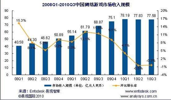 10月25日消息,易观国际今日发布报告称,其《2010年第3季度中国网络游戏市场季度监测》数据显示,2010年第3季度中国网络游戏市场收入规模达77.58亿元,环比下滑0.3%,同比增长12.6%。
