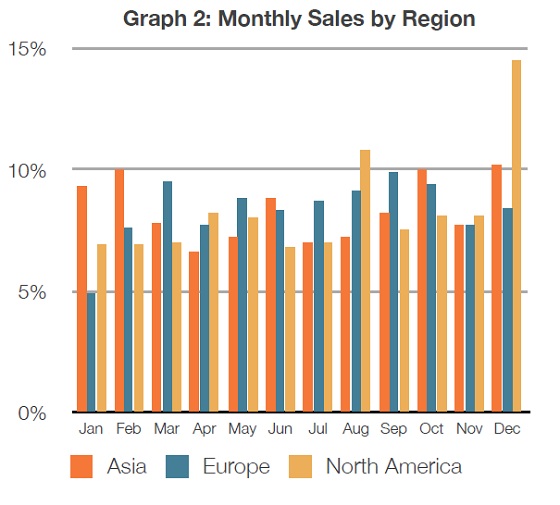 从下述列表数据可以看到在亚洲10月、12月和2月用户支出比例是最高的;而在4月、7月和8月支出比例是最低的。欧洲的情况,3月、9月和10月用户支出比例是最高的;而在1月、2月和11月用户支出比例是最低的。北美方面,4月、8月和12月用户支出比例是最高的;而在1月、2月和6月用户支出比例是最低的。