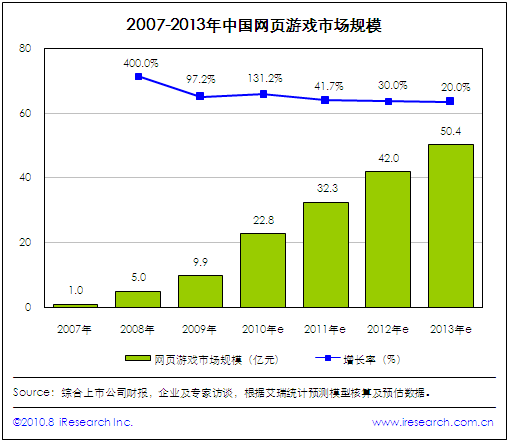 根据艾瑞数据显示,2009年中国网页游戏市场规模为9.9亿元,到2010年达到22.8亿元,同比增长131.2%,预计在2013年可突破50亿关口,达到50.4亿元。艾瑞认为,网页游戏高速发展,与2009年传统媒体及盛大等网游巨头纷纷进入网页游戏市场有关。一线厂商进驻网页游戏市场,使网页游戏中小企业面临严峻的生存压力,虽然能加快市场成熟度,促进网页游戏市场规模较大增长,但也提高了行业进入门槛。