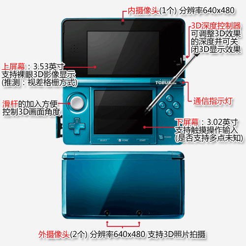 便携式游戏机3DS具备游戏机主机(影像处理电路)、显示屏及摄像头拍摄功能等所有3D功能。估计会采用视差格栅方式来显示裸眼3D影像。