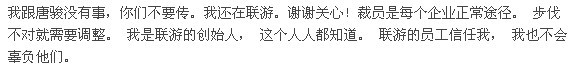 不过,今日下午,梁咏伦发表微博消息称自己跟唐骏没有事,且还在联游。对于裁员的传闻,梁咏伦表示,裁员是每个企业正常途径,步伐不对就需要调整。