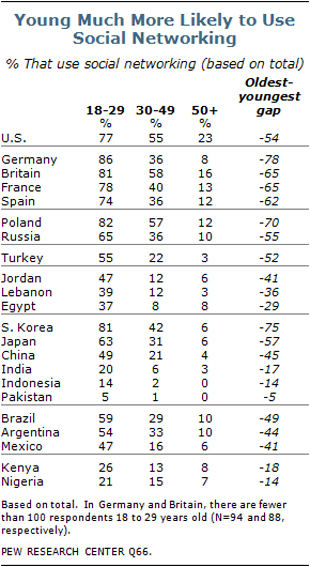 据国外研究机构Pew Research Center今年4月至5月的调查发现,社交网站虽然还只是一项新技术,但在不同经济发展水平的地区都有不少用户,在年轻群体中尤其受到青睐。