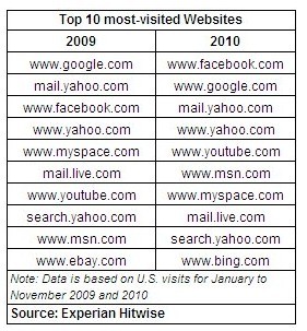 Hitwise的数据显示,今年1月至11月,Facebook占据全美访问量8.93%的份额;谷歌排在第二位,份额为7.19%;雅虎邮件以3.52%的份额排名第三,Yahoo.com和Youtube分列第四和第五位。