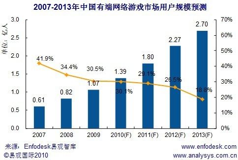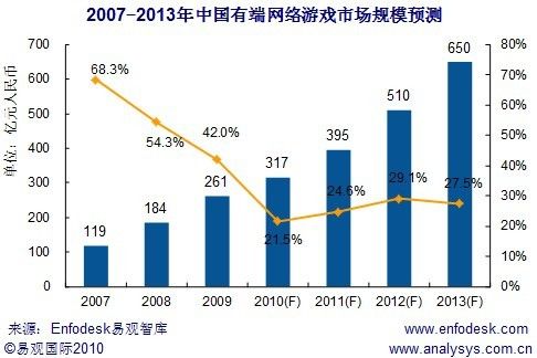 易观国际预计2010年中国有端网络游戏市场将达到317亿元,同比增长21.5%,至2013年,中国有端市场规模将达650亿元。易观乐观预测其仍将保持25%-30%的年度增长率,市场推动力在于我国二三线市场经济发展、互联网接入、以及网络游戏产品结构的丰富、质量的提升。有端网游将与网页游戏、手机游戏、社交游戏、家用游戏竞合。