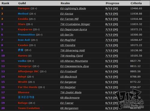 随着《魔兽世界》第三个资料片“大地的裂变”正式更新接近一个月,当前版本的团队副本世界FD争夺已经接近尾声。根据Wowprogress的最新统计,自巫妖王之怒3.2版本崛起的芬兰本土公会,欧服闪电之刃部落方的Paragon目前一骑绝尘,以9/12H的进度直接面对三大副本的关底BOSS,有小道消息称他们已经对最后的数场战斗,被戏称为“万年老二”的Method公会和世界老牌强会Ensidia紧随其后,以8/12H的进度分列二三位。
