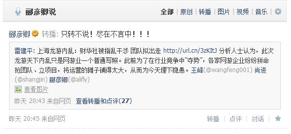 昨天某媒体报道龙游天下内乱的新闻在微博上发出后,龙游天下集团总裁郦彦卿第一时间转播并留下一句意味深长的转播理由“只转不说!尽在不言中!!!”。