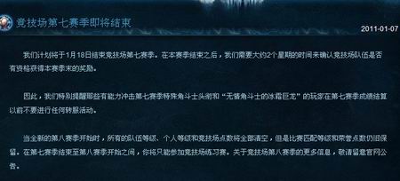 网易于1月7日正式宣布国服《魔兽世界》竞技场第7赛季将于1月18日正式结束,由于《魔兽世界》的PVP和PVE为同步更新,所以如不出意外《魔兽世界》3.3版本将和S8一起在近期登场。