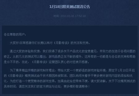 金山于近日宣布旗下2D网游《月影传说OL》1月18日精英测试取消,官网公告如下: