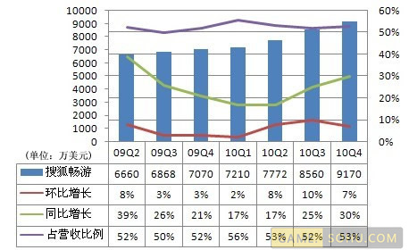 搜狐畅游(交易代码:CYOU)第四季度营收达9170万美元,环比增长7%,同比增长30%,占搜狐总营收的53%;净利润达4780万美元,环比增长6%,同比增长23%。