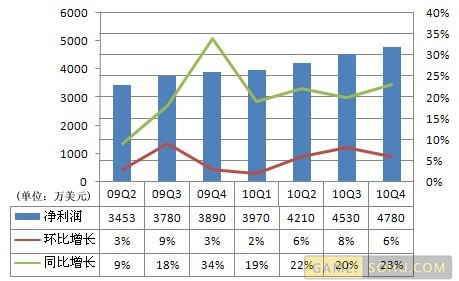 畅游第四季度的净利润达4780万美元,环比增长6%,同比增长23%。非美国通用会计准则净利润达4970万美元,环比增长5%,同比增长18%。2010年第四季度每股美国存托凭证摊薄净收益为0.93美元,高于2010年第三季度的0.88美元和2009年第四季度的0.79美元。