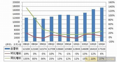 截至2011年1月31日,搜狐2010年第四季度总收入为1.732亿美元,较上年同期增长27%,较上一季度增长6%。