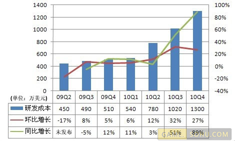 环比和同比增长主要是由于2010年第四季度员工薪酬与福利费用的增加。