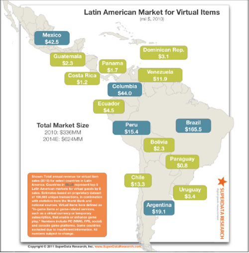 据了解,除了巴西之外,虚拟商品全年营收排在前六名的其他拉美国家分别是:哥伦比亚,4400万美元;墨西哥,4250万美元;阿根庭,1910万美元;秘鲁,1540万美元;智利,1330万美元;委内瑞拉,1190万美元。
