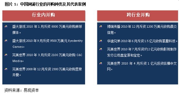 近年来,不论是国内市场,还是海外市场,并购一直是游戏行业的主题。易观资本认为,按照并购参与主体的不同,游戏行业的并购可以分为两种:行业内并购和跨行业并购。前者的代表案例是盛大游戏2010年1月斥资8000万美元收购美国网页游戏分销商麻球媒体(Mochi Media),后者的代表案例是完美世界(更名前名为“完美时空(更多厂商)”)2010年7月斥资约2亿元人民币对赵宝刚和丁芯夫妇的影视制作发行公司鑫宝源和宝宏的战略投资。