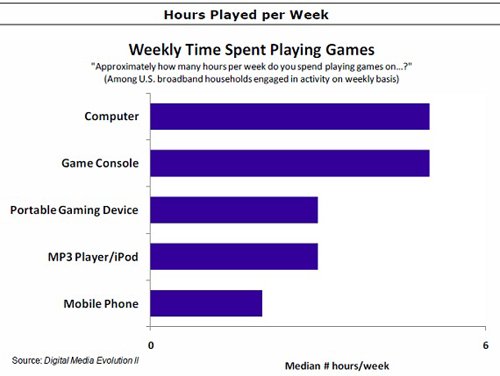 该报告针对不同游戏平台进行了分类,调查结果显示PC和游戏机打成了平手,这两个平台的玩家每周平均游戏时长均为5至5.5小时,超过了掌上游戏设备、MP3播放器/iPod、手机这三个平台的玩家平均游戏时间。