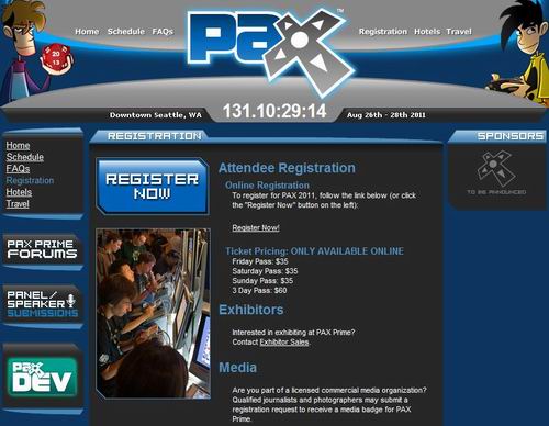 始办于2004年,一年两届的欧美著名的游戏电子展PAX(Penny Arcade Expo)近日开放了2011年西雅图PAX(又称PAX Prime,和在波士顿举办的PAX EAST区别)的官方网站,同时接受出席的游戏公司和玩家团体登记。本次西雅图Pax将于当地时间8月26-28日于西雅图会展中心举办,据举办者透露:目前已经有上百家游戏公司登记出席这次西雅图PAX,这将是规模空前的一届。(文:17173 晨星)