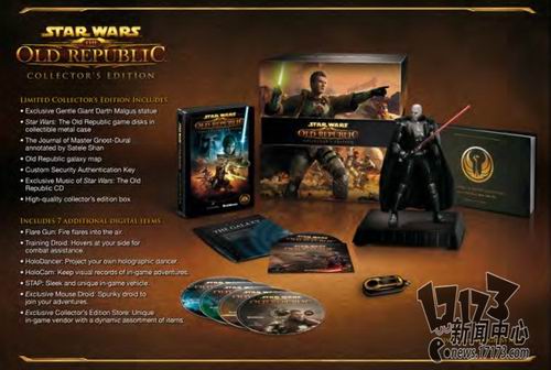 一个国外的《星球大战OL》玩家fansite今日流出一张游戏收藏版内容的截图,包括四张DVD安装盘和一个收藏金属盒、西斯领主达斯·玛洛斯的模型、主题安全验证器、旧共和国星系地图、一本游戏指南手册和一个游戏音乐原声CD。出了这些外,收藏版还将赠送一些游戏内道具如特殊宠物及坐骑等等。